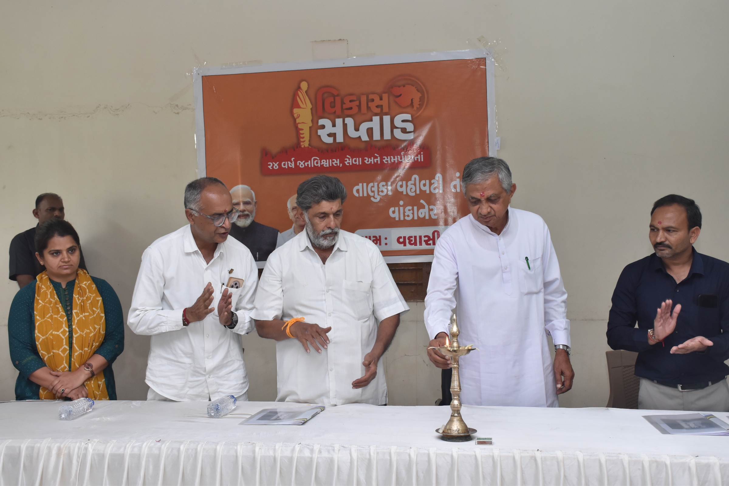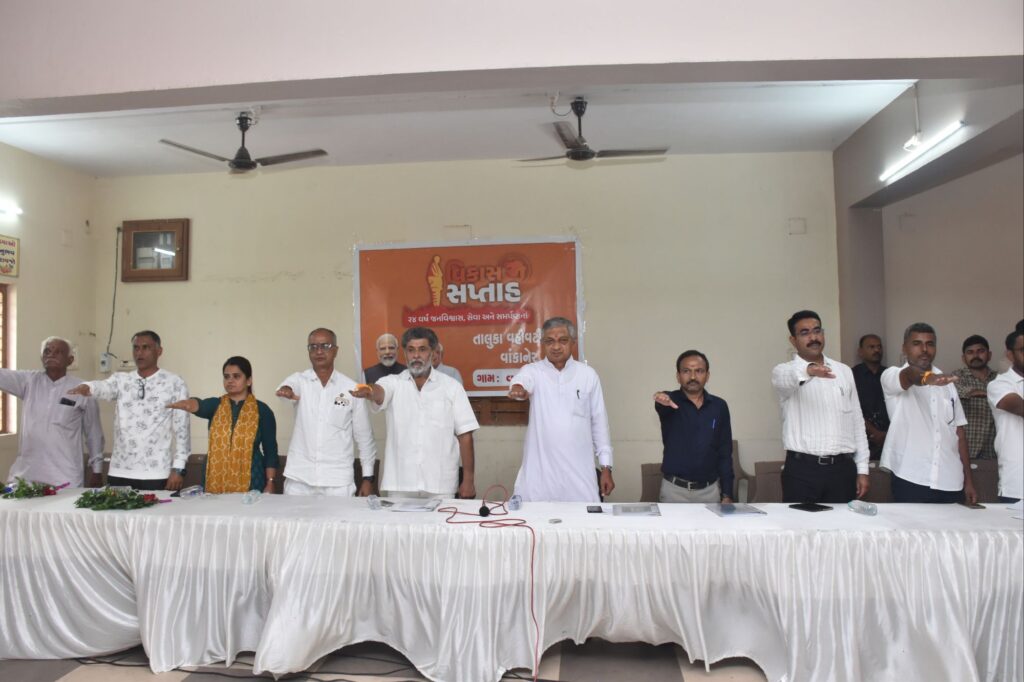 “સરકારના ભગીરથ પ્રયાસોથી આજે ગામડાની વિભાવના બદલી છે, આરોગ્ય, શિક્ષણ, પાણી, રોડ-રસ્તા સહિતના વિકાસ કાર્યો થતી ગામડાઓ વિકસિત બન્યા છે ” મોરબી જિલ્લામાં વિકાસ સપ્તાહ અંતર્ગત કેબિનેટ મંત્રીશ્રી કુંવરજીભાઈ બાવળીયાના અધ્યક્ષસ્થાને વાંકાનેર તાલુકાના વઘાસિયા ગામ ખાતે વિશેષ કાર્યક્રમ યોજાયો હતો. આ પ્રસંગેશ્રી કુંવરજીભાઈ બાવળિયાએ જણાવ્યું હતું કે, દેશના વડાપ્રધાનશ્રી નરેન્દ્ર મોદીના નેતૃત્વમાં જનશક્તિ, જળ શક્તિ, રક્ષાશક્તિ, ઊર્જાશક્તિ અને જ્ઞાનશક્તિ એ પાંચ શક્તિનો શ્રેષ્ઠ ઉપયોગ કરીને શ્રેષ્ઠ રાષ્ટ્રનું નિર્માણ થઈ રહ્યું છે. આજે વંચિત અને છેવાળાના લોકો સુધી સરકાર પહોંચી છે અને યોજનાઓની અસરકારક અમલવારી શક્ય બની છે. સરકારના ભગીરથ પ્રયાસોથી આજે ગામડાની વિભાવના બદલી છે, આરોગ્ય, શિક્ષણ, પાણી, રોડ-રસ્તા સહિતના વિકાસ કાર્યો થતી ગામડાઓ વિકસિત બન્યા છે. ગામડાઓમાં શાળા અને આરોગ્ય કેન્દ્રના અધ્યતન બન્યા છે. જ્યોતિગ્રામ યોજનાથી ૨૪ કલાક નિયમિત વીજળી શક્ય બની છે. ગામડાઓમાં વિશાળ પ્રમાણમાં રોજગારીઓનું સર્જન કરવામાં આવ્યું છે તથા પીએમ કિસાન શનિધિ સહિતની અનેક યોજનાઓએ ખેડૂતોને સબળ બનાવ્યા છે. વધુમાં તેમણે સૌને સ્વદેશી વસ્તુઓ અપનાવા અનુરોધ કર્યો હતો. ધારાસભ્યશ્રી જીતુભાઈ સોમાણીએ પ્રાસંગિક પ્રવચનમાં જણાવ્યું હતું કે, જન જન સુધી વિકાસની ફલશ્રુતિ પહોંચાડવા વિકાસ સપ્તાહની ઉજવણી કરવામાં આવી રહી છે. દેશ અને ગુજરાતમાં થયેલ વિકાસ થકી આજે સામાન્ય વ્યક્તિના જીવન ધોરણમાં આમૂલ પરિવર્તન આવ્યું છે. વધુમાં મંત્રીશ્રીની ઉપસ્થિતિમાં વઘાસિયા ગામના તળાવના વિકાસ માટે તેમની ગ્રાન્ટમાંથી નાણાકીય રાશી ફાળવવામાં આવી હતી. આ પ્રસંગે સર્વે ઉપસ્થિતોએ મુખ્યમંત્રીશ્રીની પ્રેરક ઉપસ્થિતિમાં વિકાસ સપ્તાહ અંતર્ગત યોજાયેલ કાર્યક્રમનું જીવંત પ્રસારણ નિહાળ્યું હતું અને વિકાસ ભારત પ્રતિજ્ઞા પણ લીધી હતી. આ પ્રસંગે વાંકાનેર પ્રાંત અધિકારીશ્રી વિપુલ સાકરીયા, મામલતદારશ્રી કે.વી. સાનિયા, તાલુકા વિકાસ અધિકારીશ્રી પાયલબેન ચૌધરી, અગ્રણીશ્રી હરુભા ઝાલા, જિલ્લા પંચાયત અને તાલુકા પંચાયતના સદસ્યશ્રીઓ, વઘાસિયા તથા આજુબાજુ ગામના અગ્રણીઓ તેમજ ગ્રામજનો ઉપસ્થિત રહ્યા હતા