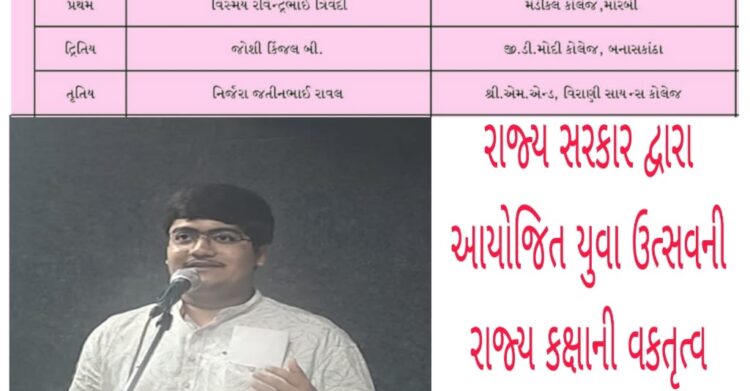 રાજ્ય સરકારના યુવા અને સાંસ્કૃતિક પ્રવૃત્તિઓ દ્વારા આયોજિત યુવા ઉત્સવની રાજ્ય કક્ષાની વકતૃત્વ સ્પર્ધામાં મોરબી મેડિકલ કોલેજમાં અભ્યાસ કરતો વિસ્મય ત્રિવેદી પ્રથમ સ્થાને વિજેતા થયો છે. 'મહેનતની મહતા વધુ કે ભાગ્યની ભવ્યતા....? વિષય પર બોલતા વિસ્મયે વિવિધ ઉદાહરણો અને સાહિત્યિક ભાષા શૈલી દ્વારા નિર્ણાયકોના તથા શ્રોતાઓના દિલ જીતી લીધા હતા. આ અગાઉ વિસ્મય સમગ્ર ગુજરાત રાજ્યમાં બાળ પ્રતિભા વકતૃત્વ, યુવા ઉત્સવની શીધ્ર વકતૃત્વ, કલામહાકુંભ વકતૃત્વ, યુવા ઉત્સવની વકતૃત્વ સ્પર્ધામાં તથા સૌરાષ્ટ્ર યુનિવર્સિટી યુથ ફેસ્ટીવલની વકતૃત્વમાં પણ વિજેતા થઈ ચૂક્યો છે. આ ઉપરાંત વિસ્મયે ટેબલટેનિસમાં પણ ખેલ મહાકુંભ અને મહાનગરપાલિકા કક્ષાએ પુરસ્કારો પ્રાપ્ત કર્યા છે.